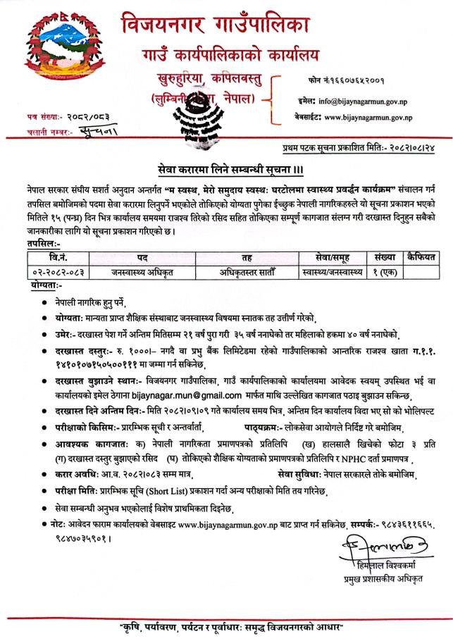 जनस्वास्थ्य अधिकृत पदको सेवा करारमा पदपूर्ती गर्ने सम्बन्धी सूचना ।