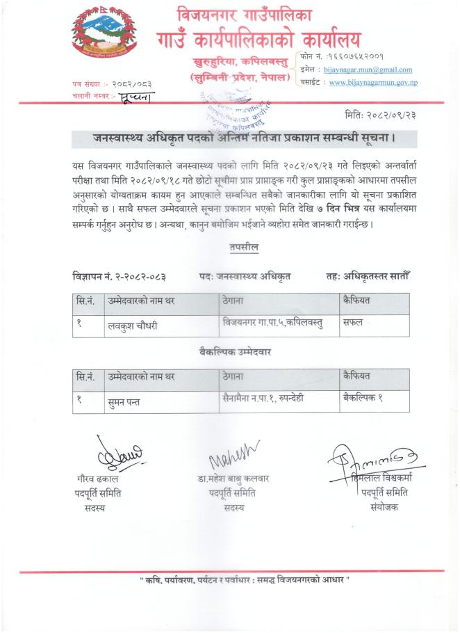 जनस्वास्थ्य अधिकृत पदको अन्तिम नतिजा प्रकाशन सम्बन्धी सूचना ।