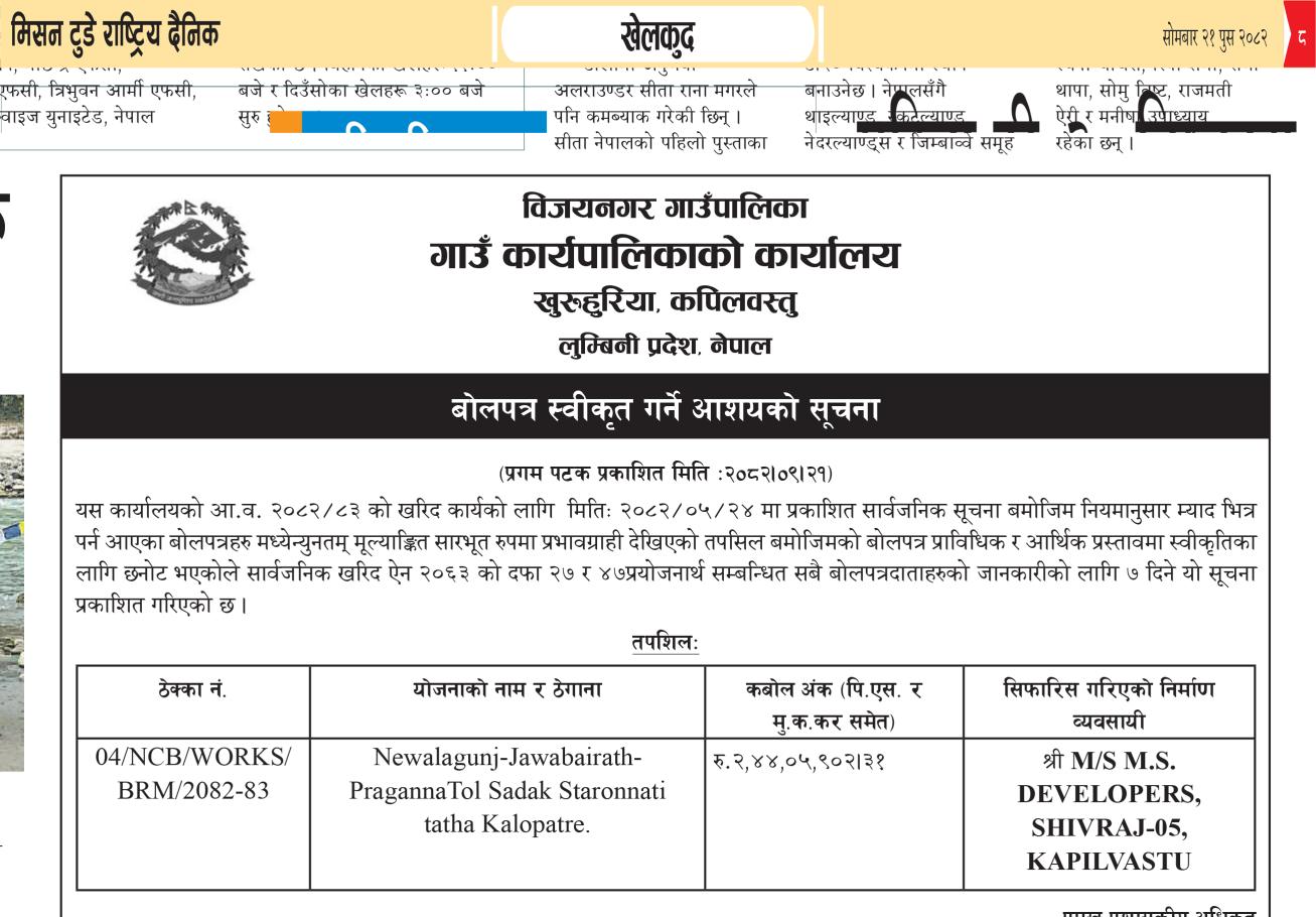 बोलपत्र स्वीकृत गर्ने आशयको सूचना ।
